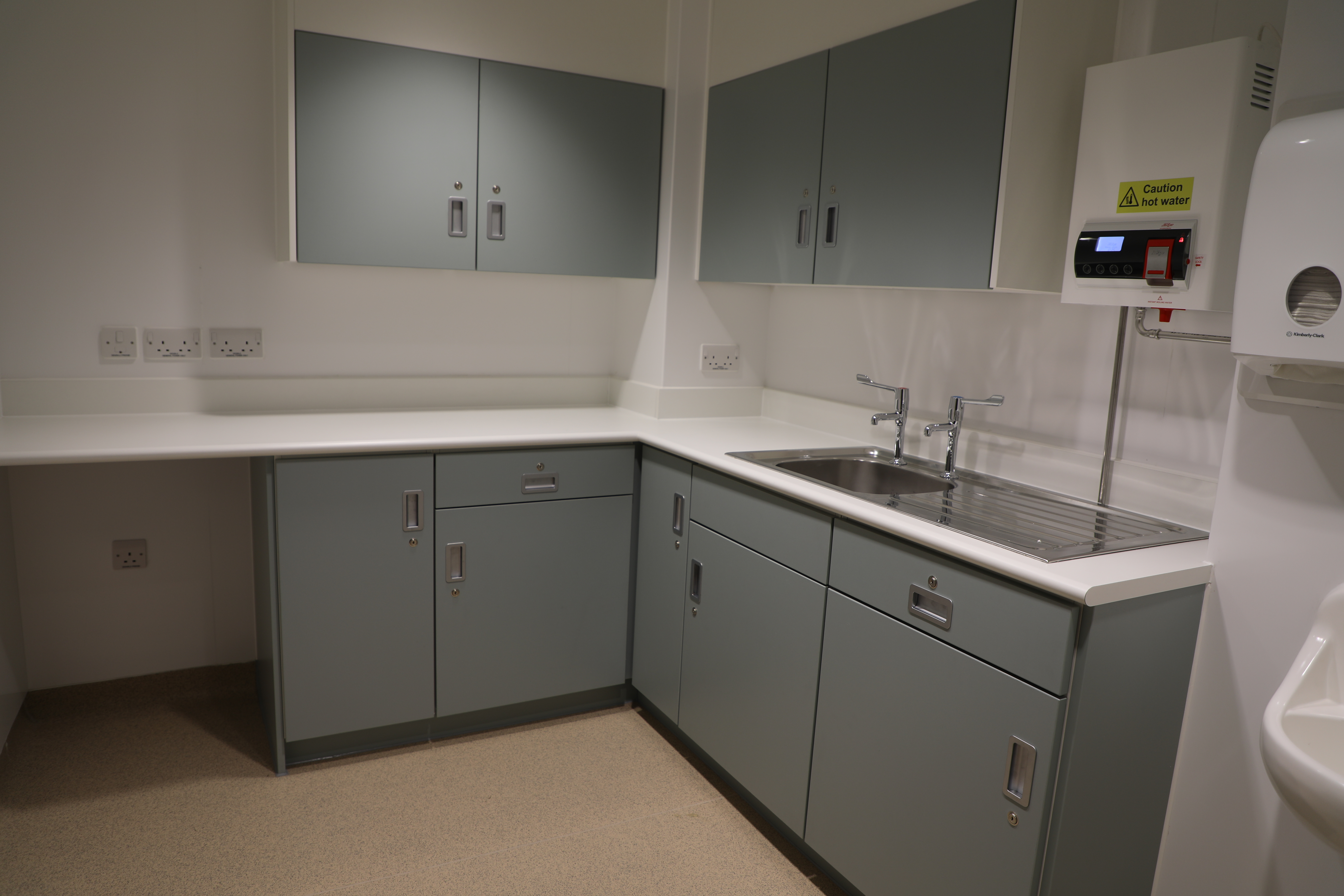 We designed, manufactured and supplied various bespoke anti-ligature health care furniture products for the Fraser Ward inside Cornhill Hospital in Aberdeen. Cornhill hospital is a centre for the care and treatment of people with mental health problems and the Fraser Ward is a specialist ward inside the hospital. The client required the following products for the ward; open tall units, open bedside units, headboards, nurses’ desks, healthcare units and shelves, and base and wall units for the staff room, clinic preparation room and the laundry room. These were all design and manufactured by our in-house furniture team.